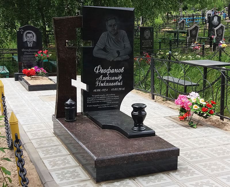 Стандартный комплект памятника включает в себя стелу, подставку и цветник. Плитка приобретается по желанию заказчика и за отдельную плату. Вместо цветника можно установить надгробную плиту.